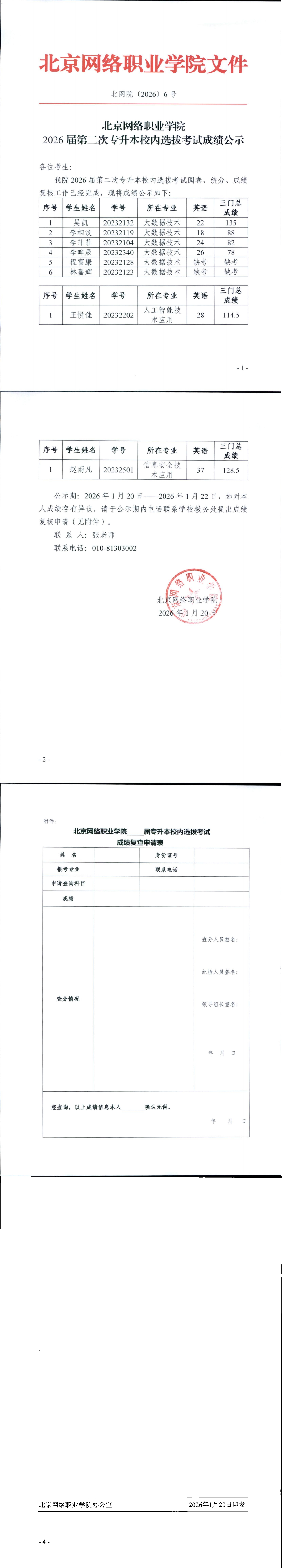 北京网络职业学院2026届第二次专升本校内选拔考试成绩公示