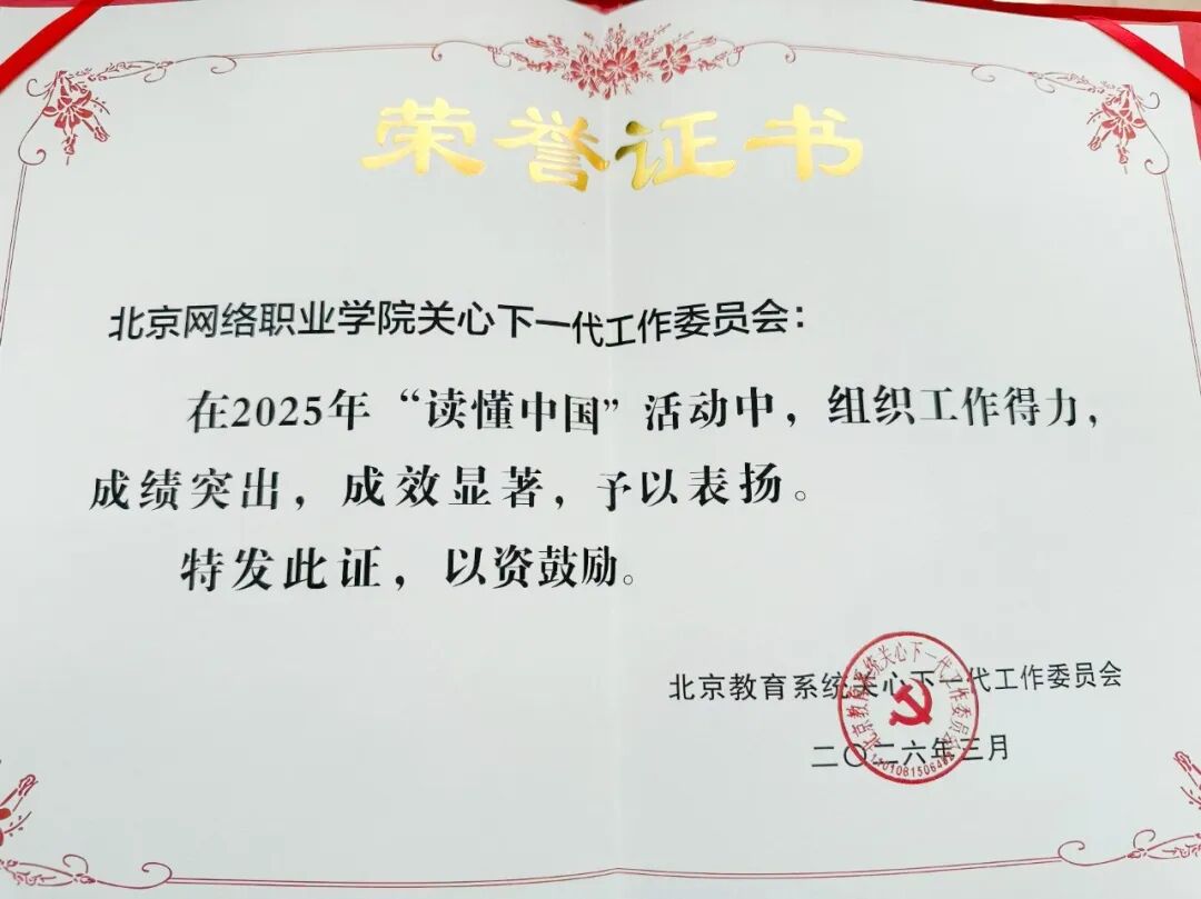近日,北京市教育系统关心下一代工作委员会发布2025“读懂中国”活动评审结果,北京网络职业学院选送的两部微视频作品双双获奖,学校同时获评本次活动优秀组织单位。