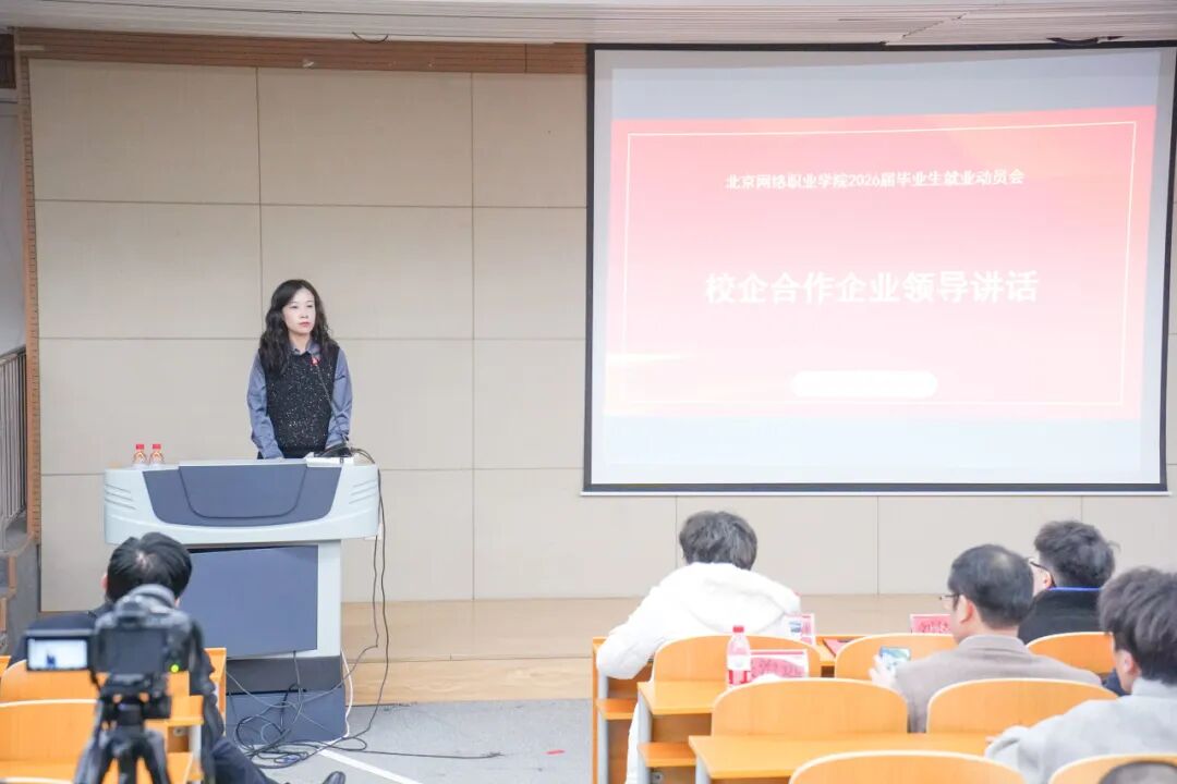 2025年11月13日下午,北京网络职业学院在8号楼阶梯教室8110隆重举行2026届毕业生就业工作动员大会。会议由刘雪竹副院长主持,学院领导、合作企业代表、毕业班德育导师及2026届全体毕业生共同参与,现场气氛热烈,掌声不断。