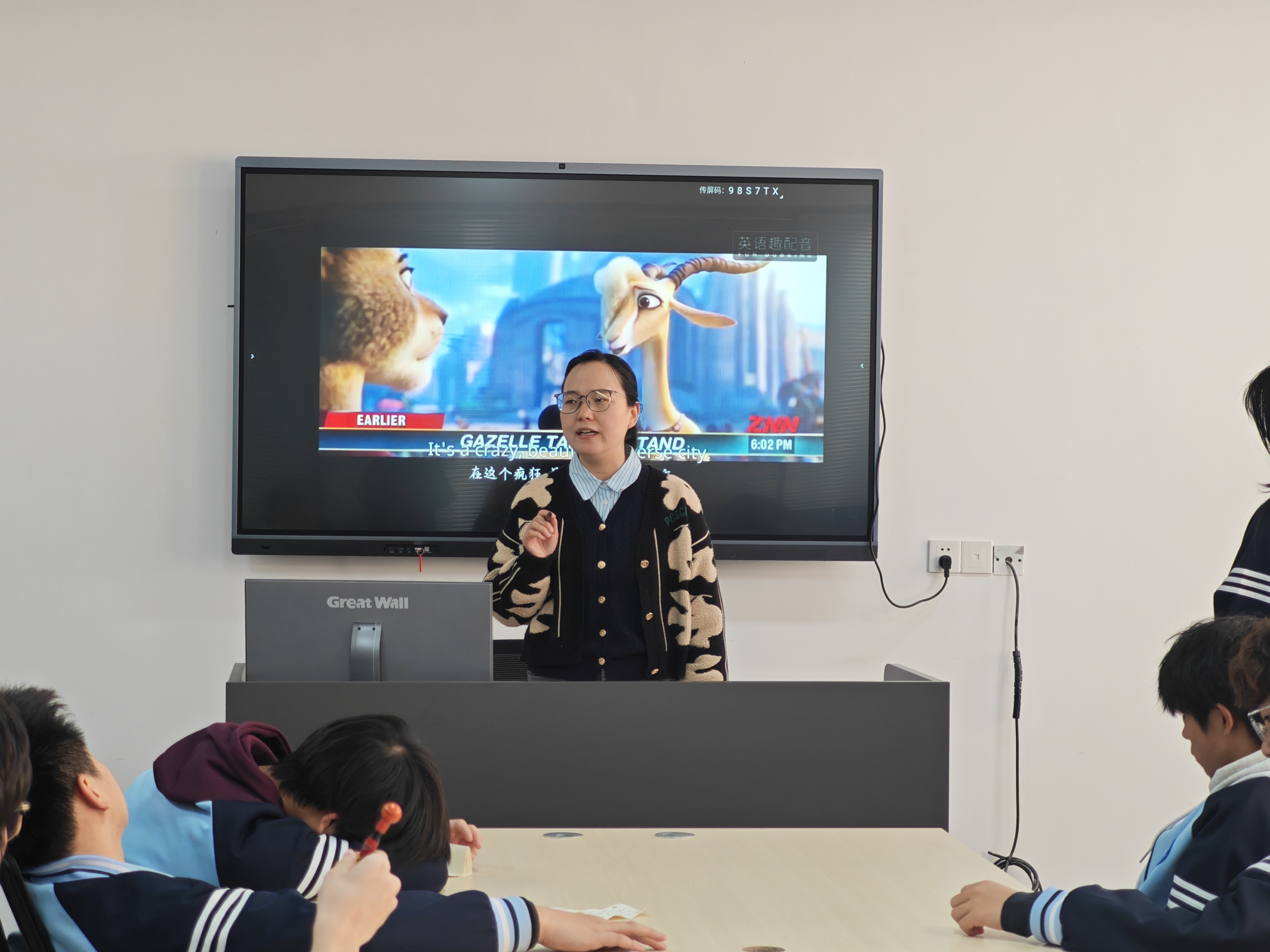 本次教学创新以 “在玩中学、在配中练” 为核心原则,教师结合学生兴趣特点,精选《疯狂动物城》《狮子王》《冰雪奇缘》等经典动画片段作为教学素材。同时,立足五年一贯制学生的英语基础差异,实施分层任务设计:针对基础薄弱学生,聚焦简单台词与拟声词训练,降低开口门槛;针对基础较好学生,侧重主角对话与情感独白演绎,强化语音语调和语言表现力。课堂上,学生以小组为单位分工协作,沉浸式投入角色塑造,课堂氛围生动活泼,学习参与度显著提升。